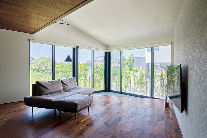 敷地に対して斜めに配置したことで三角形の土間や、緑を眺めるコーナー窓ができました。