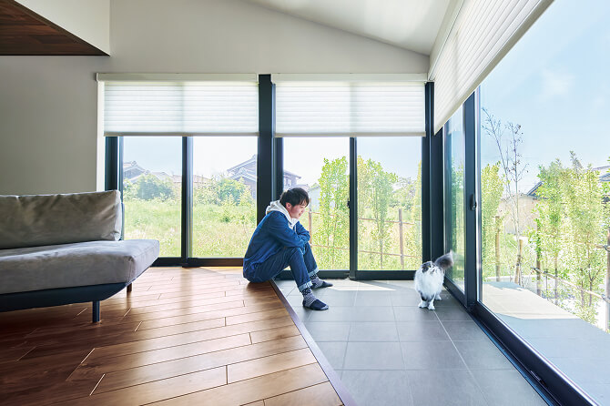 床材のウォルナットとタイルが調和した空間。ロールスクリーンは少し下を開けておけば、愛猫たちはいつでも外を眺められます。