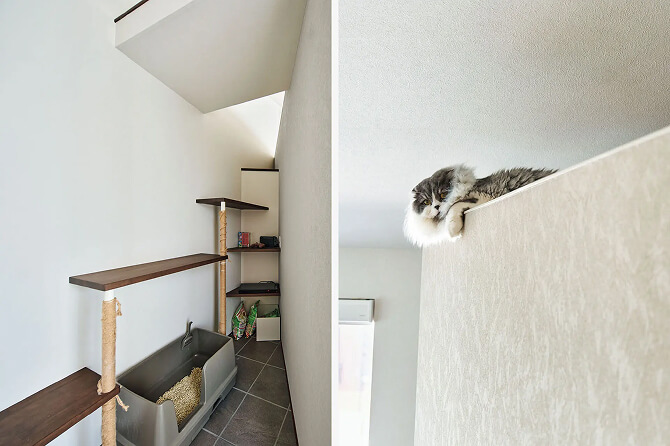 斜めの壁の裏には、猫用の階段とともに猫トイレやテレビの配線などが隠されています