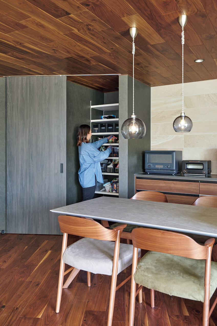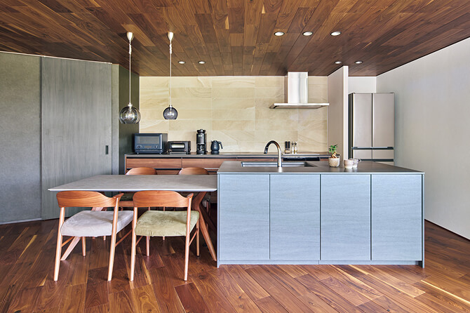 シンク側は効率を重視してテーブルとつなげました。天井と床はウォルナットで仕上げています。
