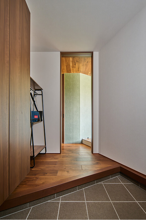 落ち着いた雰囲気の空間を斜めに切り取る入り口。その先に続くLDKへの期待が高まります。