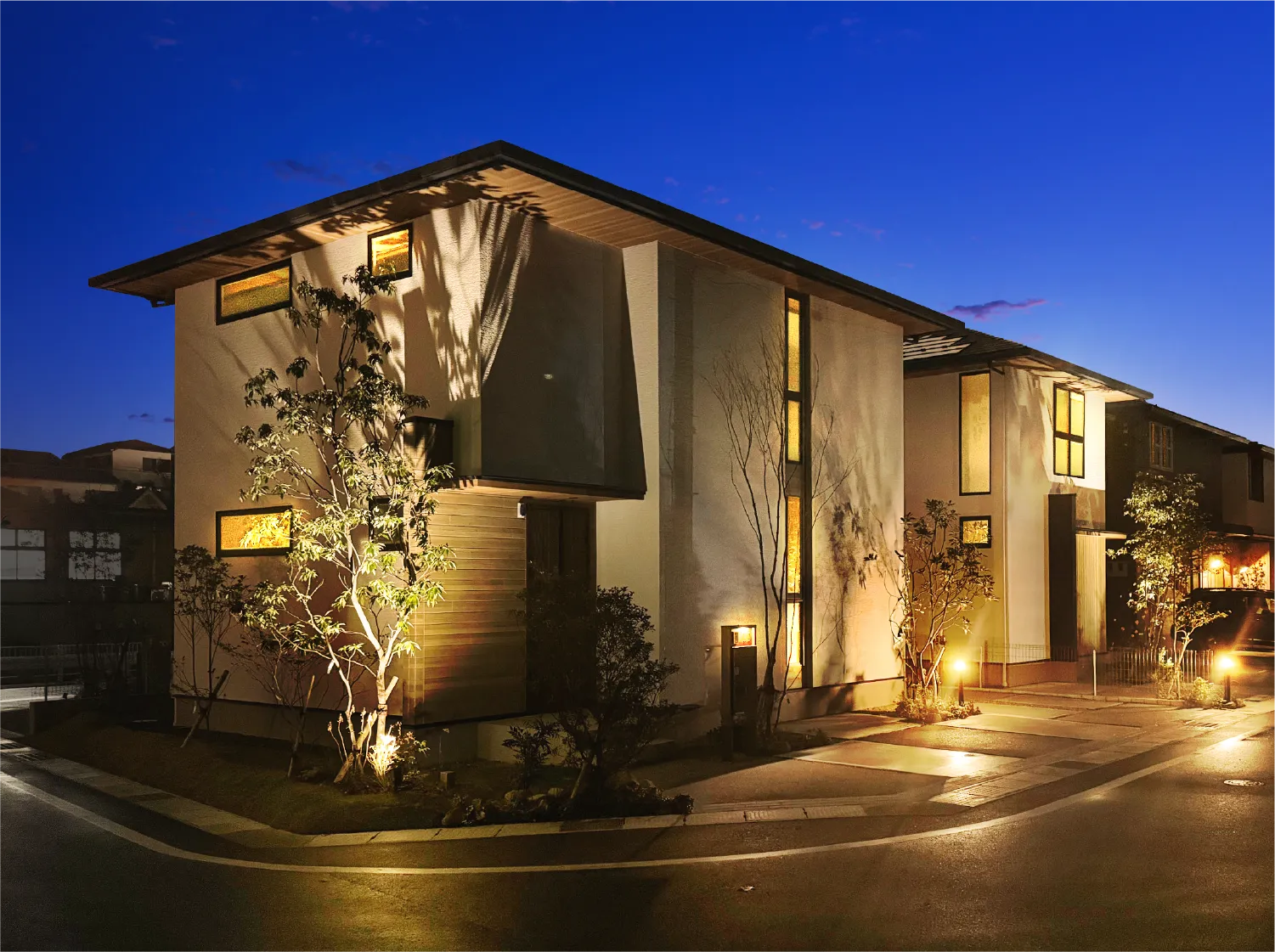 外構は見れば見るほど好きです。ライトが特に良いですね。帰ってきた瞬間、光が出迎えてくれる感じ。