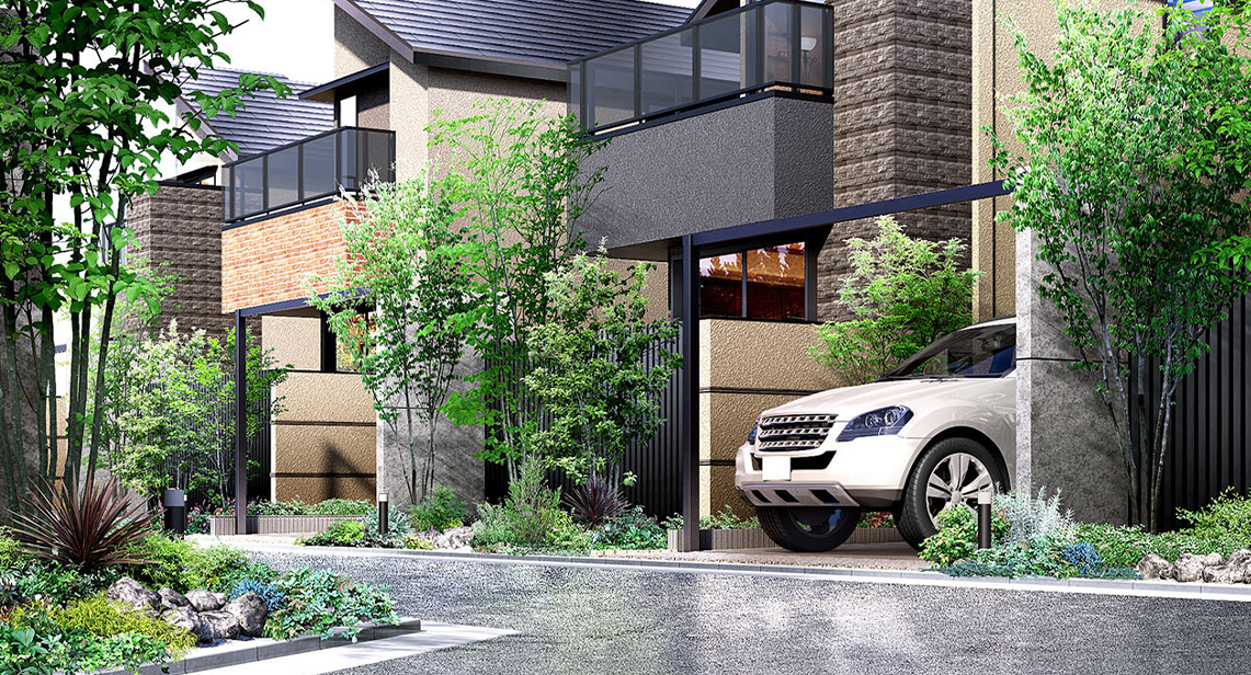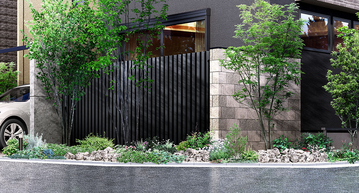 - ※植栽は、竣工時には完成予想イラスト程度には成長しておりません。また植栽は特定の季節の状況を示すものではありません。