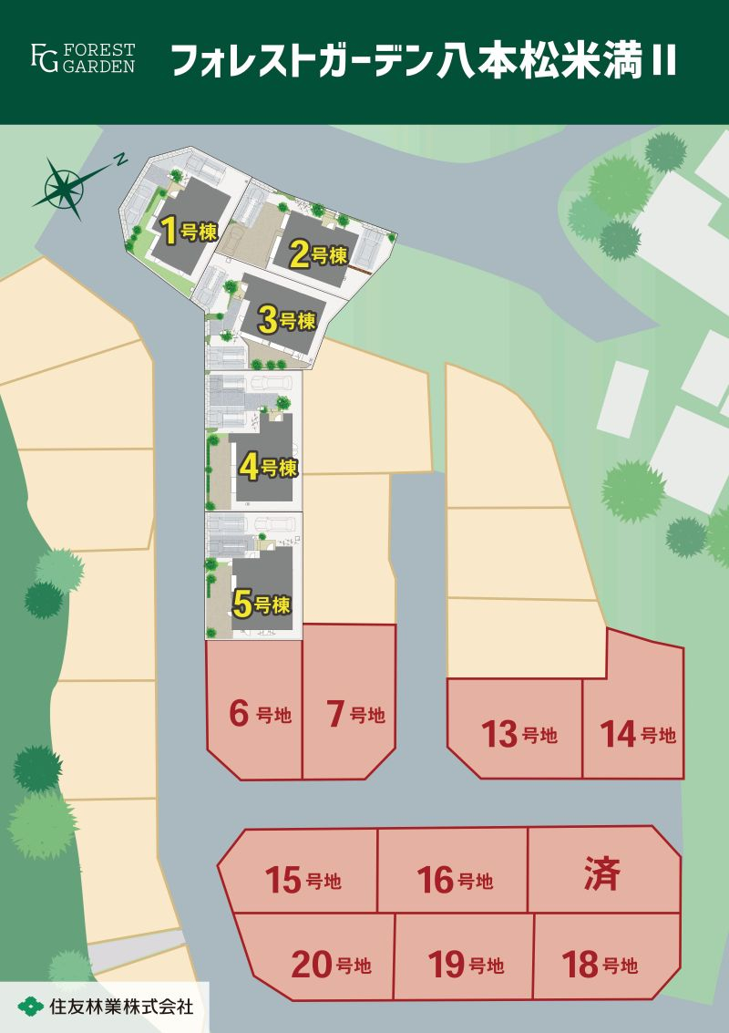 - 33区画(内、住友林業所有区画数15区画:戸建分譲5戸、建築条件付宅地10区画)