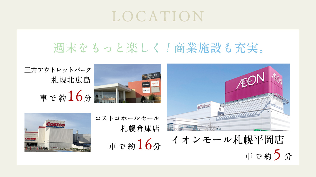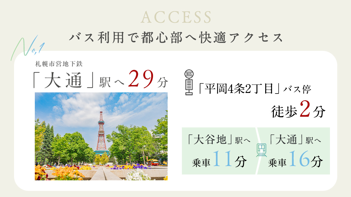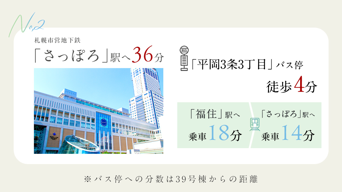 - 北海道中央バス「平岡4条2丁目」バス停まで徒歩2~7分・北海道中央バス「平岡3条団地」停徒歩2~6分・北海道中央バス「平岡3条3丁目」停徒歩4~9分