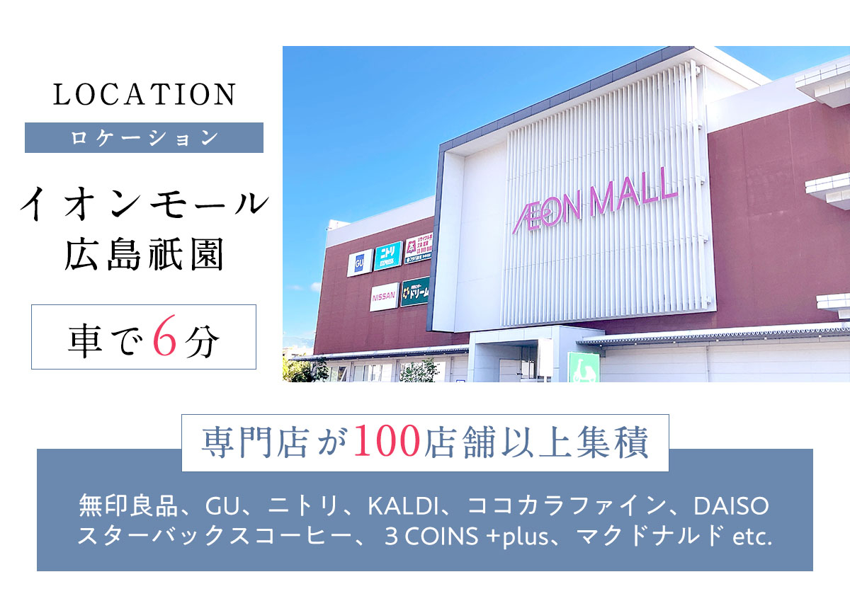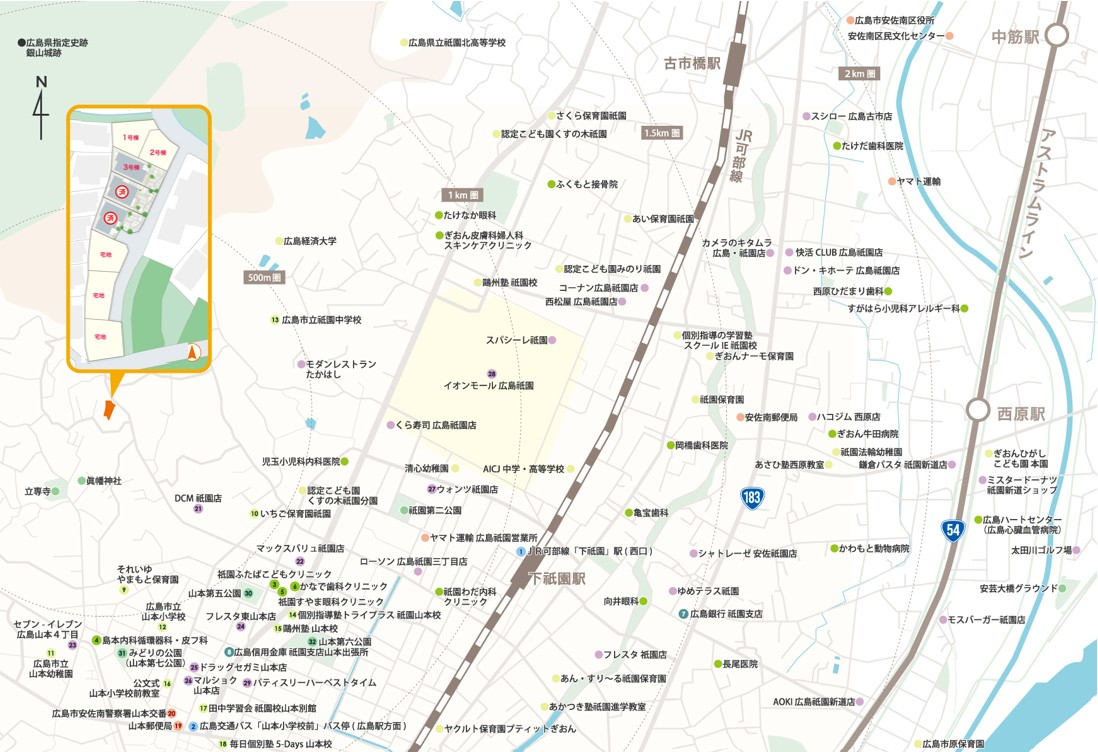 - JR可部線「下祇園」駅まで徒歩18分~19分(約1,400~1,460m)、広島交通バス「山本小学校前」バス停(広島駅方面)徒歩14~15分(約1,100~1,160m)