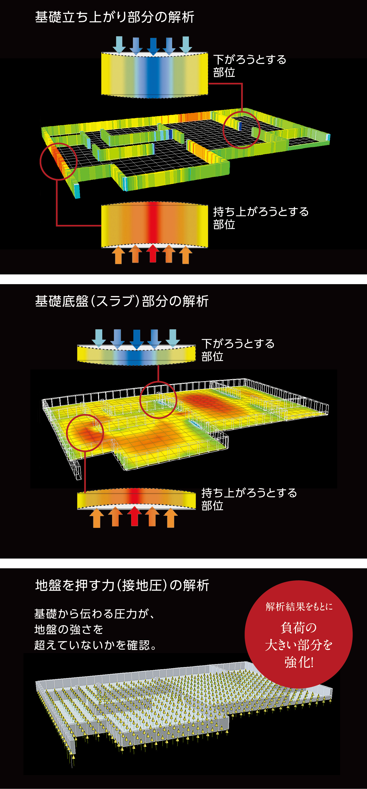 強靭なビッグフレーム構法の建物を支える基礎は、オリジナル構造計算システム「WiNX」を用い、プランに合わせて一邸一邸綿密に設計します。コンクリートの強度、基礎の形状、かぶり厚など、綿密な設計により高い耐震性を確保しています。