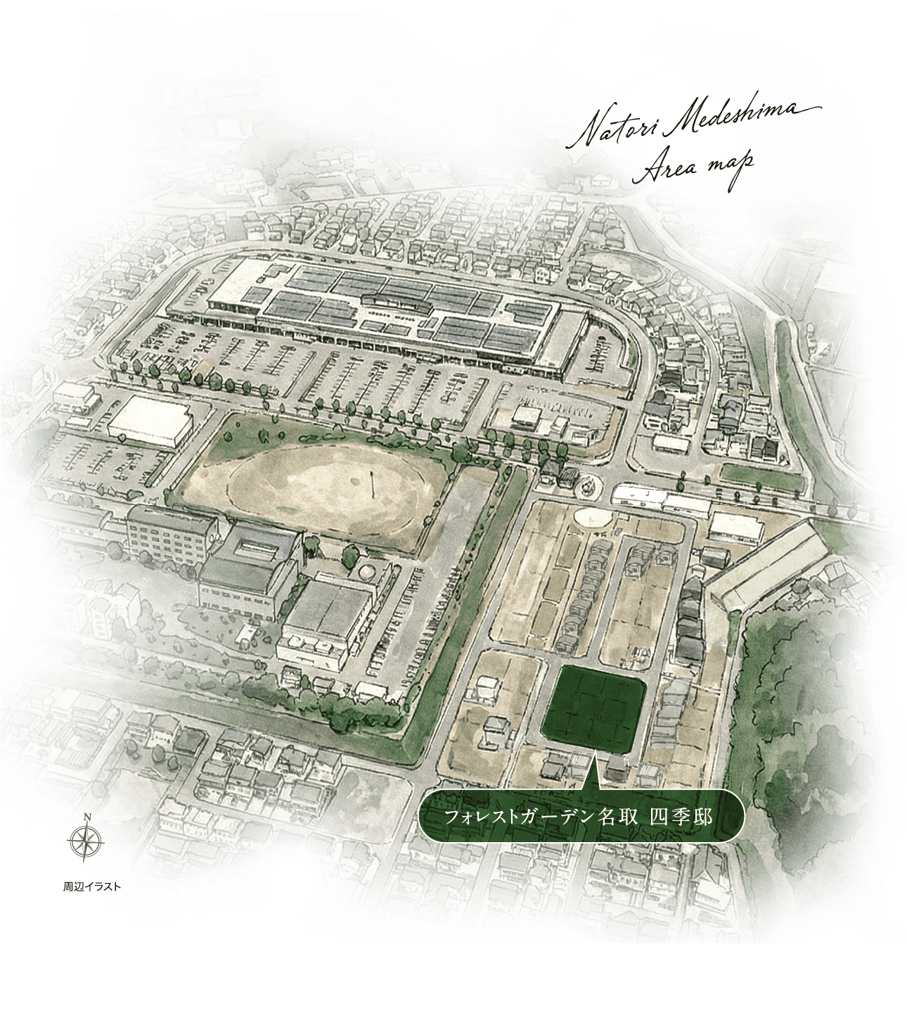 - 掲載の周辺イラストは、空撮写真(2025年7月撮影)を基に描き起こしたもので、地形・道路・建物の形状、距離感等は実際とは異なります。