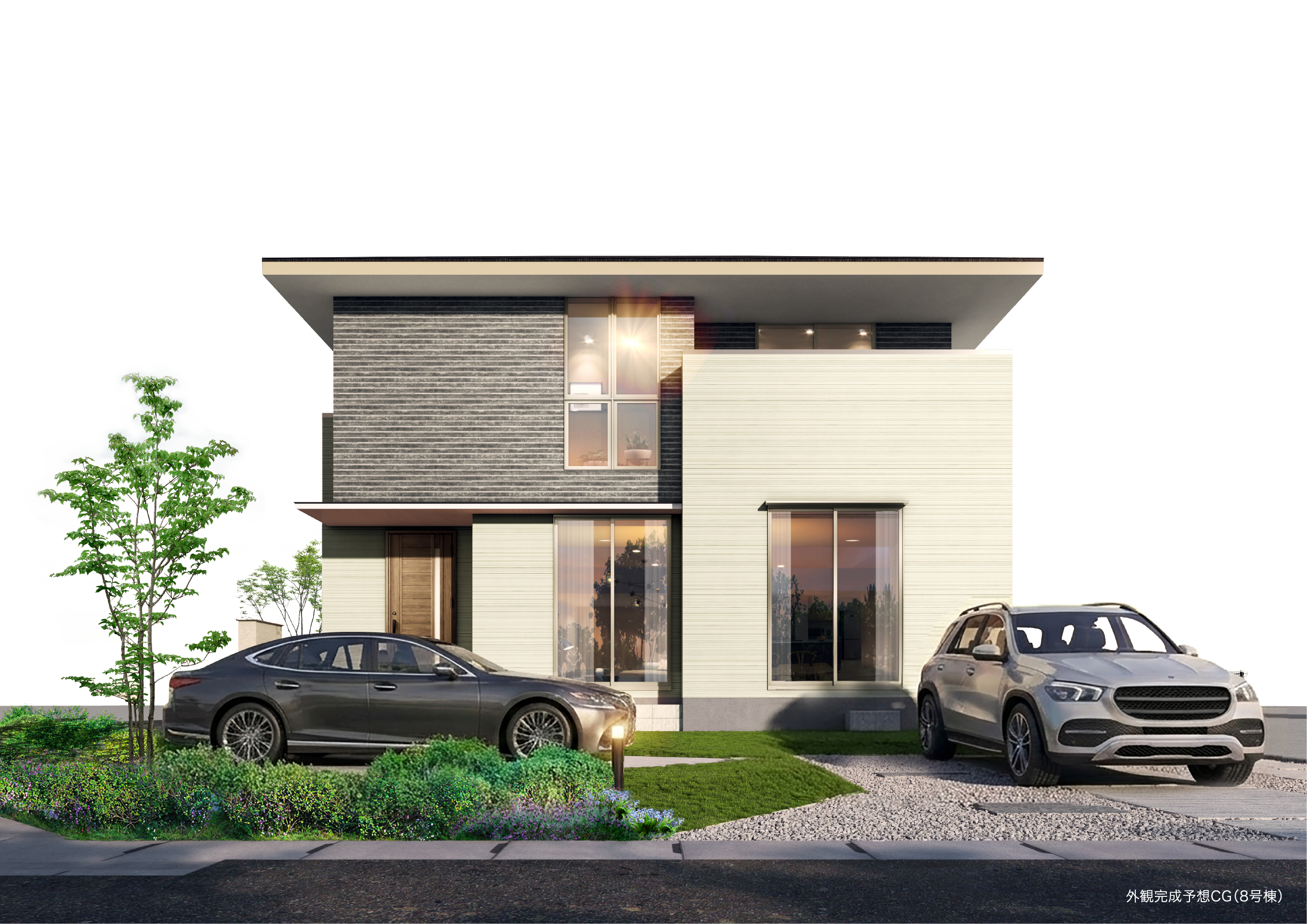 - 植栽の樹種・大きさについては、未確定となっており、竣工時には完成予想図程度に成長してはおりません。また植栽は特定の季節の状況を示すものではありません。