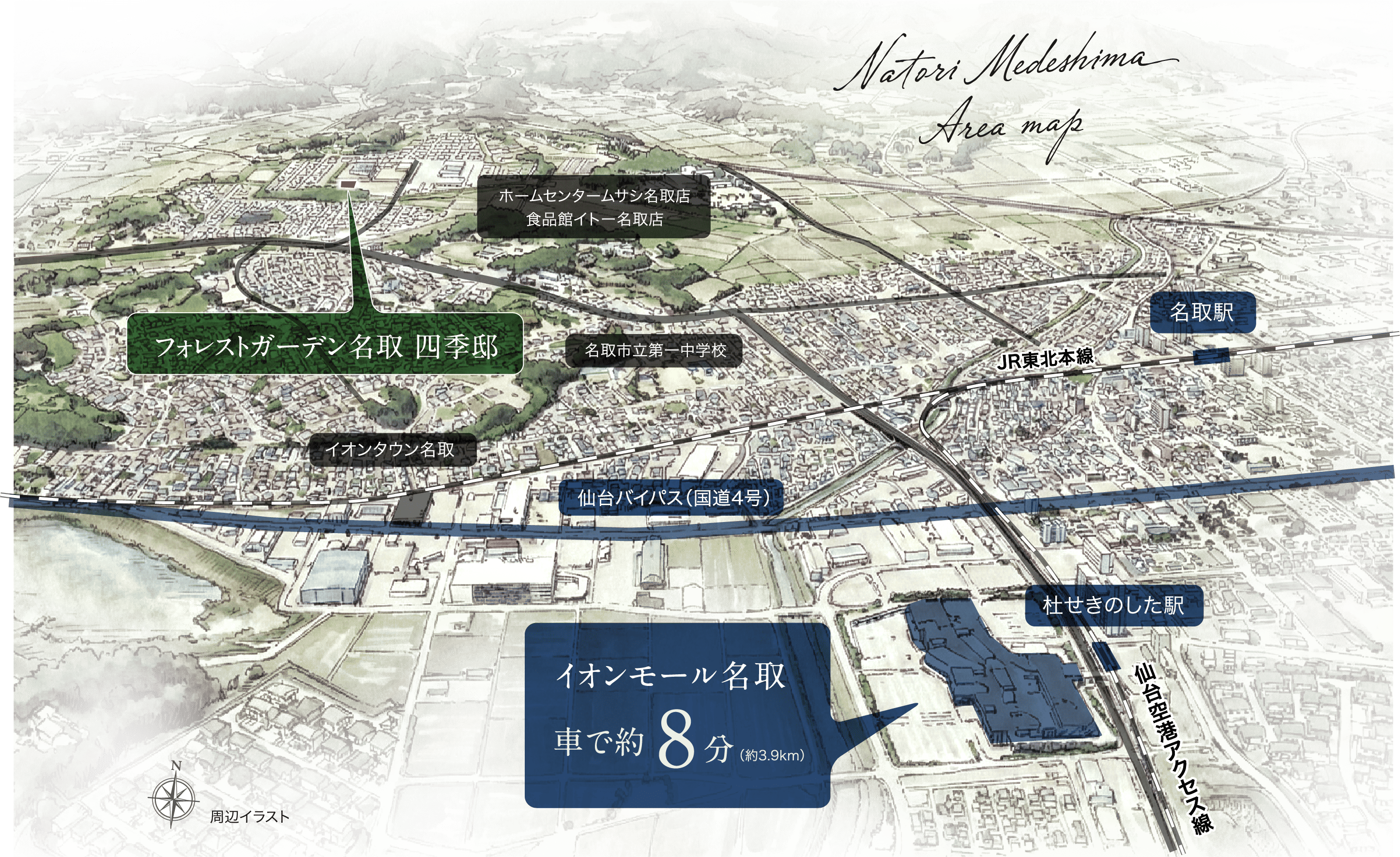 ※1「名取」駅西口までコミュニティバス乗車約18分。「愛島郷1丁目」バス停まで徒歩4分