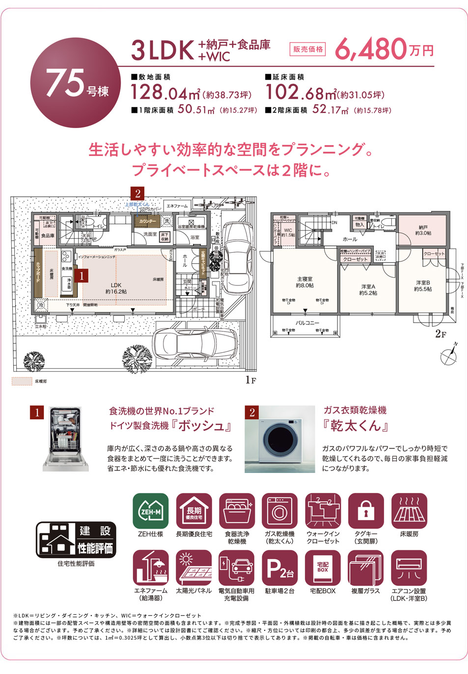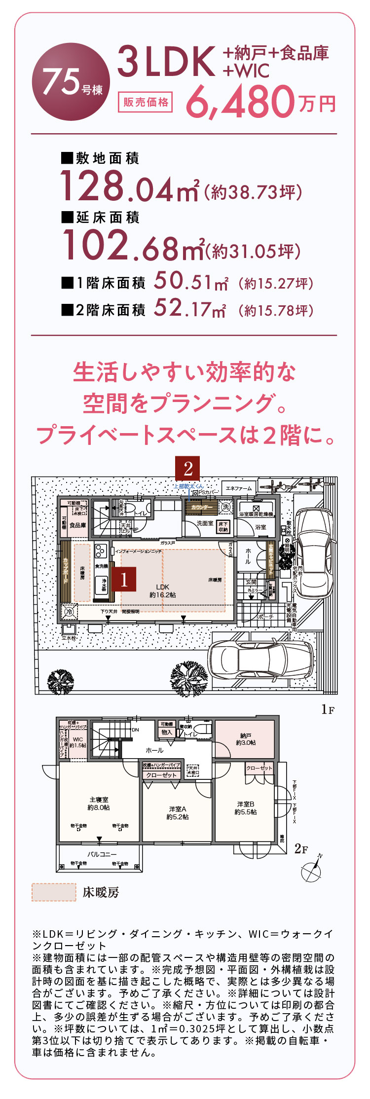 - ※LDK=リビング・ダイニング・キッチン、WIC=ウォークインクローゼット、EC=玄関収納