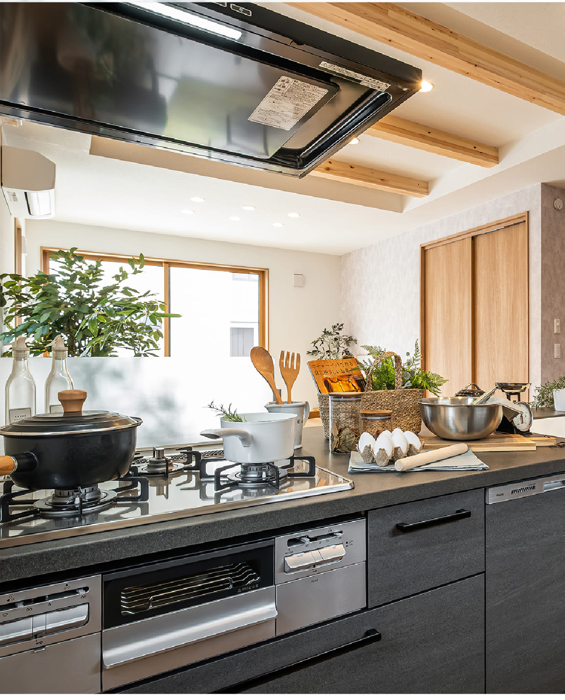 構造を支える梁の素材感をそのままに活かした「あらわし梁」。上質な木質感が空間に広がり、 伸びやかな開放感を生み出します。家族と過ごす穏やかな時間が、リビングに流れます。