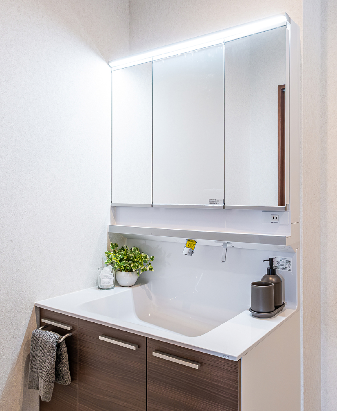 手をかざすだけで点灯・消灯でき、濡れた手でも安心です。鏡の端から端まで均一に照らすワイドな光が、顔に影を作らず身支度を快適にします。