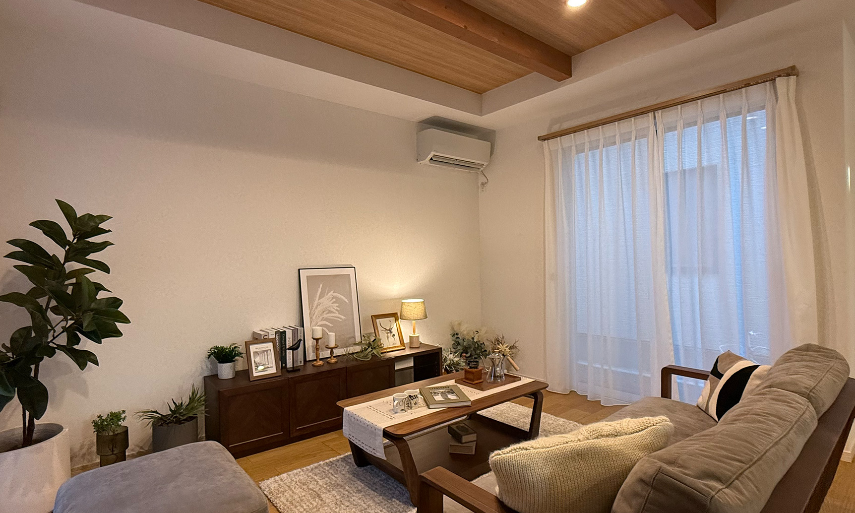 折り上げ天井の現し梁が木の温もり