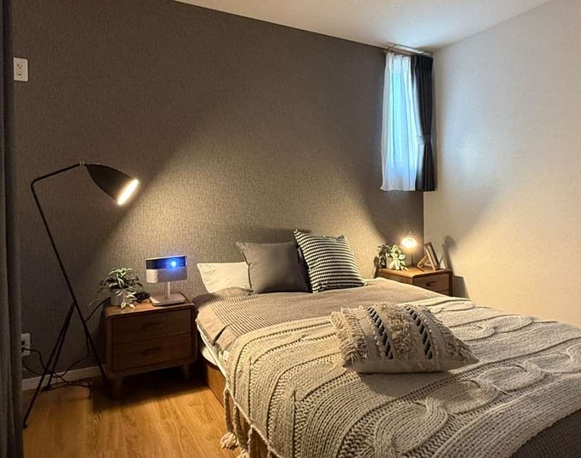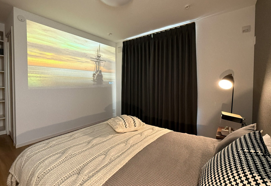 主寝室には、映画館のような迫力を楽しめるプロジェクター用の壁面を確保。