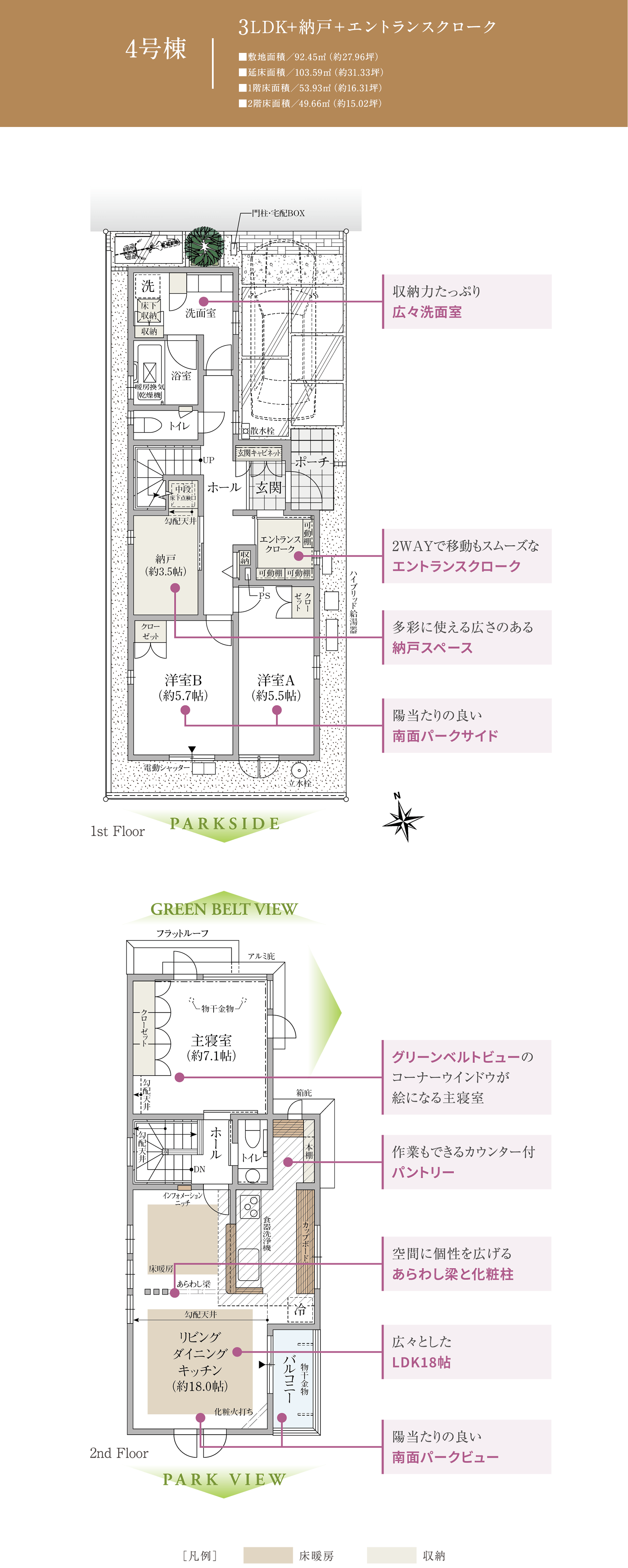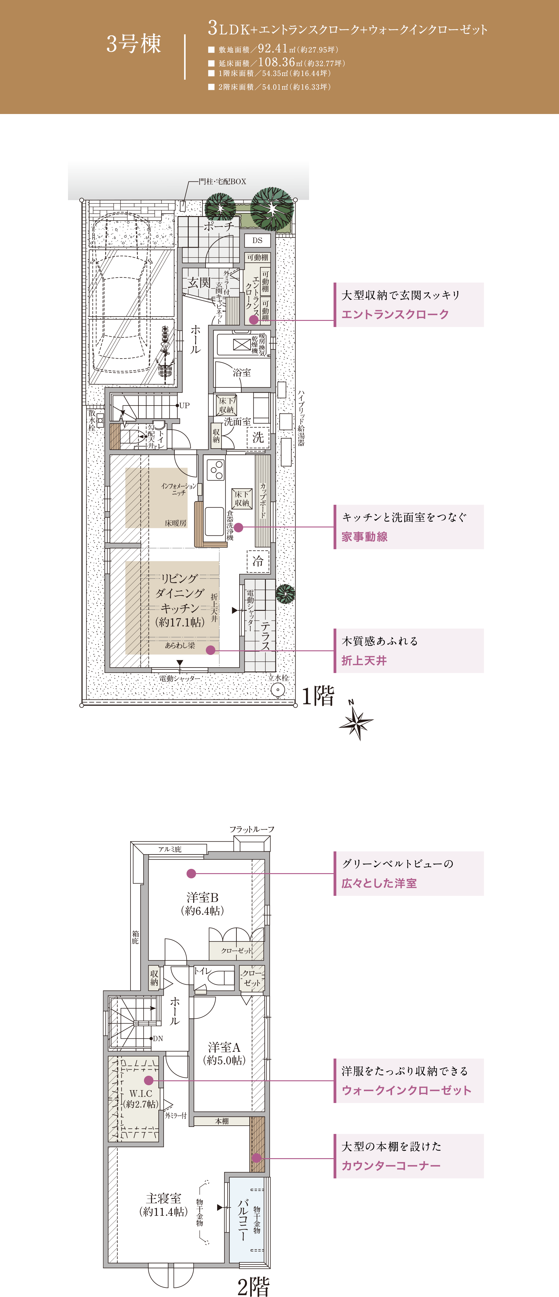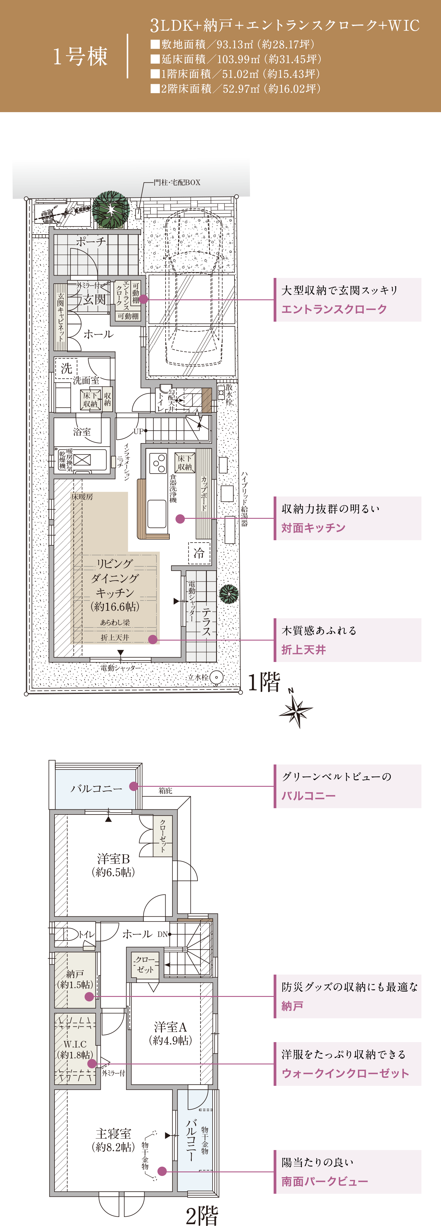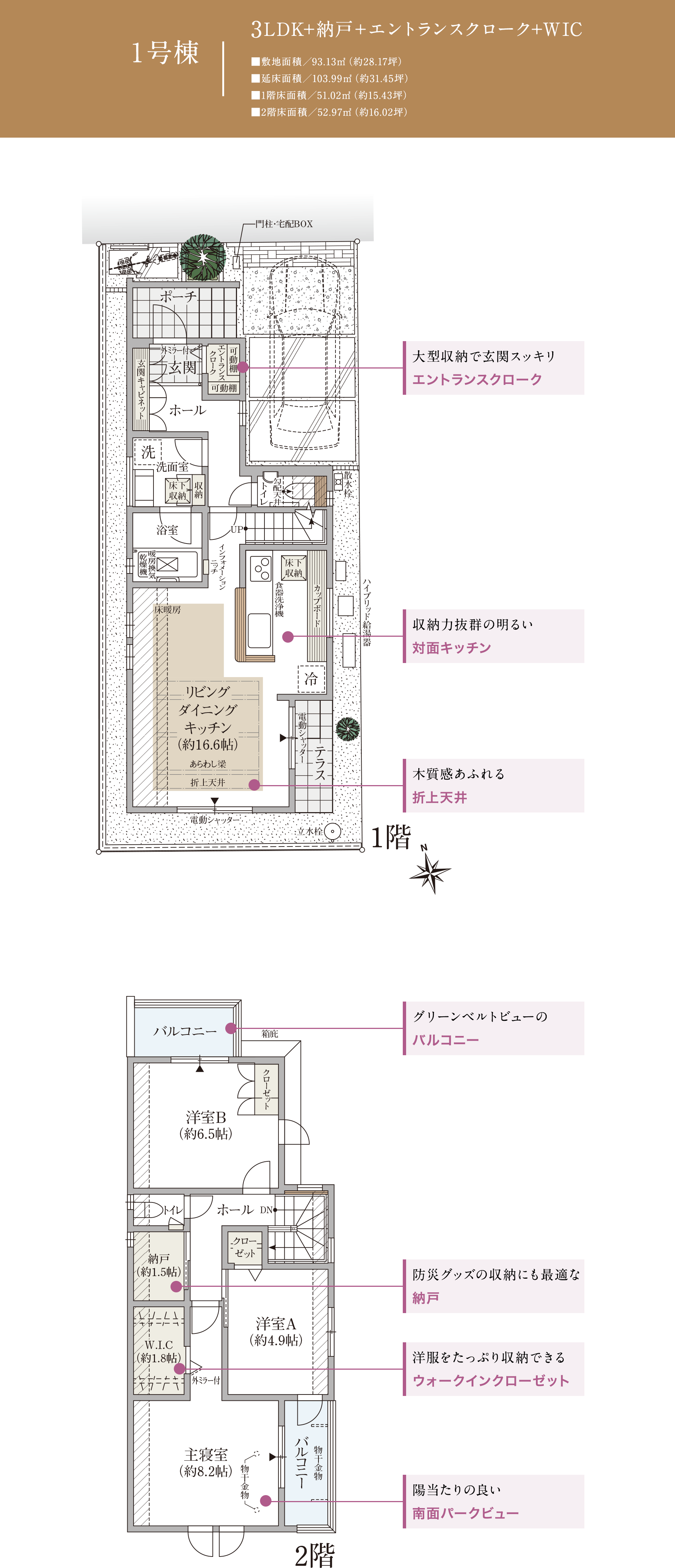 エントランスクロークやワイドな洗面台など、収納力と機能性を備えた空間設計が、暮らしに心地よさをもたらします。