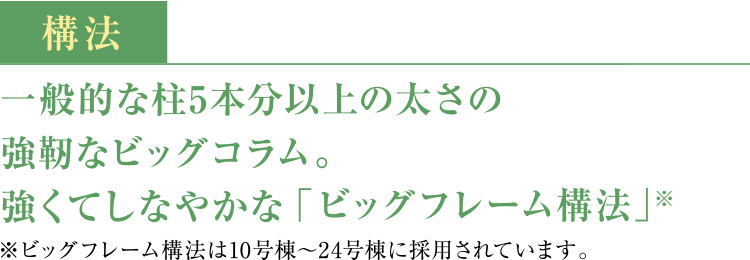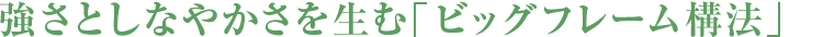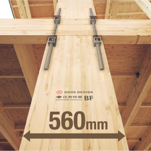 一般的な105mm角の柱の約5倍、560mm幅のビッグコラムを主要な構造材とするビッグフレーム構法。十分に乾燥させた板材(ラミナ)を何層にも貼り合せることにより、高い強度と優れた寸法安定性を実現しています。
