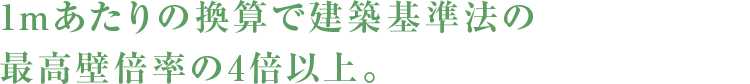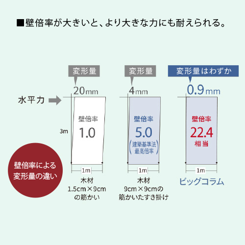 壁倍率とは、地震時などに建物を支える耐力壁の強さを表す数値です。壁倍率が大きいほど建物の変形を抑え、より大きな力に耐えることができます。ビッグコラムと梁の接合強度を検証する加力実験の結果、建築基準法の最高壁倍率5.0をはるかに超える壁倍率22.4相当を確認しています。