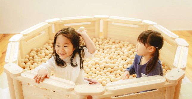 キッズスペースでは、未就学児から小学校中学年までをお預かり。 木でできたボールプールに加え、おもちゃなどもご用意しています。