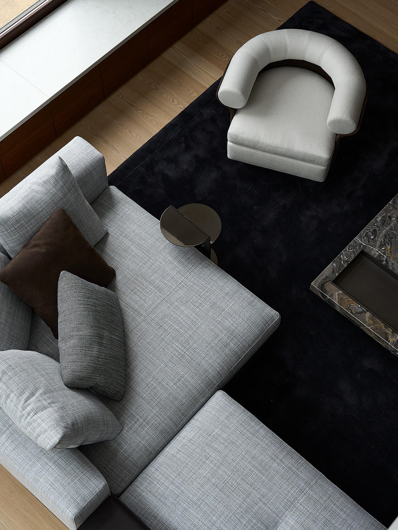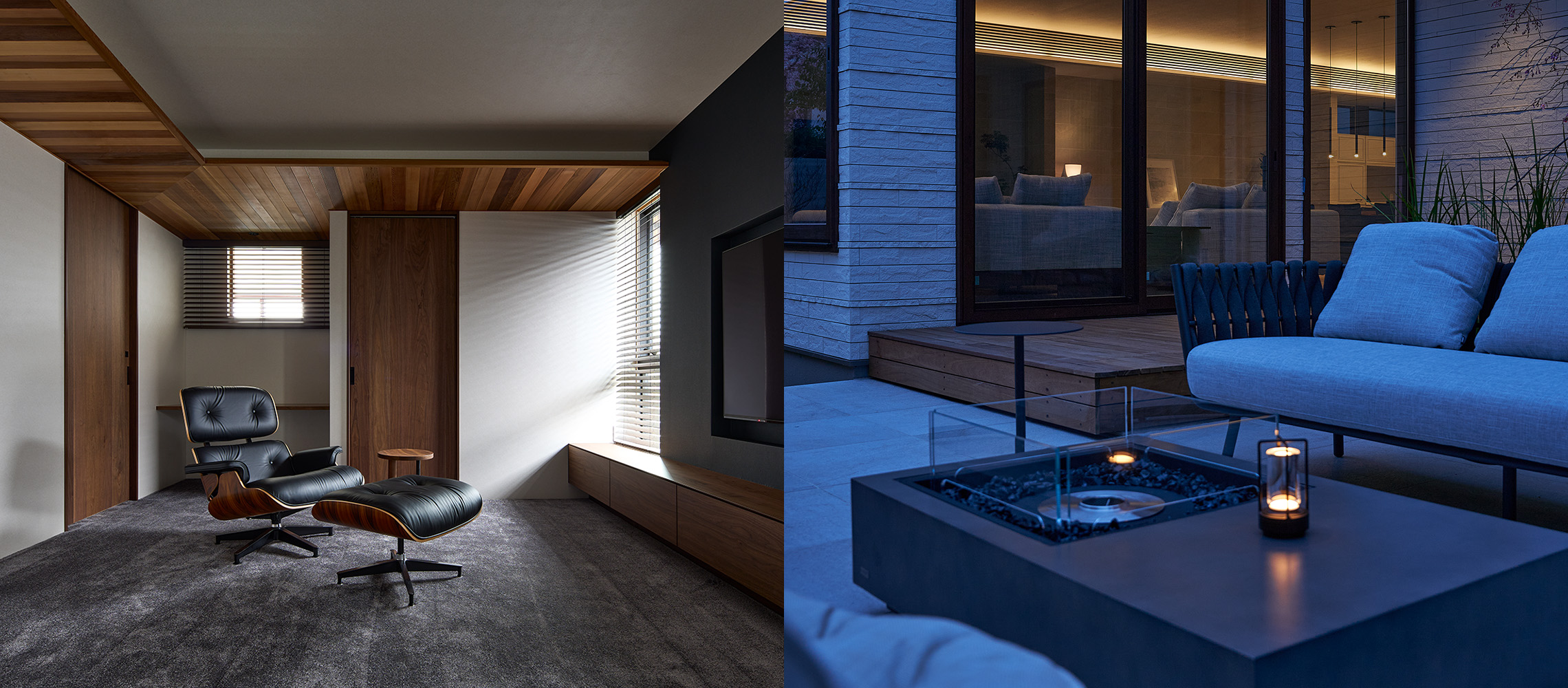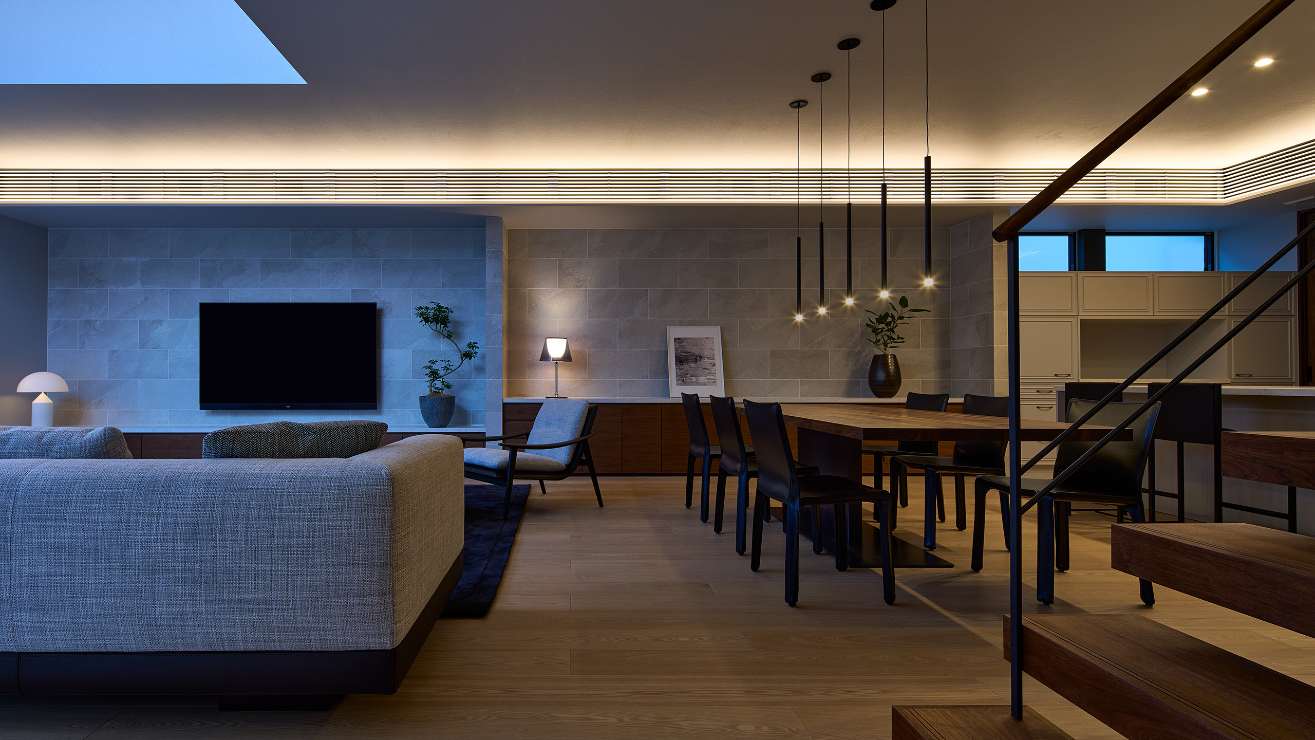 夕暮れ時から夜にかけて、間接照明中心の柔らかなあかりで満たされるリビング。