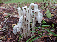 アキノギンリョウソウ(和名はギンリョウソウモドキと言います)は葉緑素を持たない、菌従属栄養植物で、姿かたちはまったく似ていませんがツツジの仲間です。春に咲くギンリョウソウとは親戚関係です。花は俯いて咲きますが、実ができる頃になるとまっすぐ上を向くようになります。