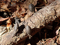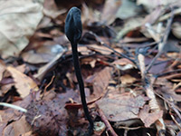 目立たなく変わった形の黒いキノコ、テングノメシガイ(天狗の飯櫂)
