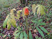 森の中で一際目を引くものがあります。朱色のトウモロコシのようにも見えます。マムシグサの仲間の実です。この植物はコンニャクやサトイモの仲間ですが、栄養状態によって雄株から雌株、または雌株から雄株へと性転換するらしいです。