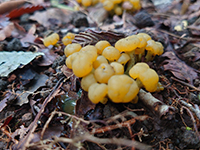 シトシトと小雨が降る日が多いことで、森の中ではキノコたちがたくさん発生しています。ハタケシメジ、ナラタケモドキ、ヌメリツバタケモドキなどの食用菌やツキヨタケが大きな群落となって発生しています。ツキヨタケは有毒キノコで、日本で一番誤食による中毒が多く発生するキノコです。見た目が如何にも美味しそうに見え、シイタケやムキタケ、ヒラタケなどに似ているためです。半分に切ってみると根元に黒いシミのようなものがツキヨタケの見分ける簡単なポイントです。