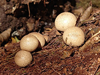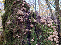 小春日和の続く日々があり、森の中では11月になってもキノコが多く見られました。朽ちかけた切り株にはホコリタケが群生しており、一箇所にこれほど大量に発生している様子は初めて目にする光景でした。別の朽木にはイタチタケが群生していました。イタチタケは傘の色がイタチやテンの体色に似ているのが名前の由来だと考えられます。傘の縁には白い綿毛のような被膜があるのが特徴ですが、脱落しやすいので見分ける時には注意が必要です。また、色鮮やかなヒイロチャワンタケも見られました。