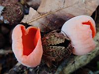 色鮮やかなアキヤマタケは蝋細工のような見た目です