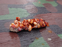 フォレストアークの近くに小さな水場があり、そこではいろいろな野鳥や動物たちが集まり、水浴び、水飲みをしながら、興味深い出来事を繰り広げています。近くに設置しているセンサーカメラがその様子を捉えていますが、時折センサーカメラの箱の上にも動物たちの活動の痕跡が残されています。今回は箱の上にテンの糞が残されていました。ツルマサキかツルウメモドキの赤い実をたくさん食べたのでしょう。糞も赤色に染まっていました。