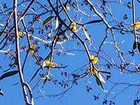 陽の光を浴びてキラキラと輝くように見えるヤドリギの黄色い実