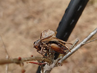 2023年に植樹をした木の枝にコロンとしたものが刺さっているのが見えます。良く見てみるとコオロギが枝に刺さっています。これはモズの「はやにえ(早贄)」と呼ばれるものです。モズが自分の備蓄食ためと言うのがこれまでの有力説でしたが、最近は恋愛成就の栄養食のためと言われています。「はやにえ」を多く準備したモズの雄は春先にそれを食べて栄養補給を良くすることで様々な啼き声ができるようになってパートナーに強くアピールできるのだそうです。モズは漢字で「百舌鳥」と書くように、昔から様々な啼き声を持つ鳥として知られていました。そんなモズの一面が垣間見えました。