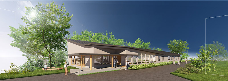 ・ 緑豊かなキャンパスや隣接する玉川上水の景観に溶け込むよう木造平屋建てにしています。開口部は全て森に面して視線が抜けるようにし、利用者に自然とのつながりや安らぎの感覚をもたらします。