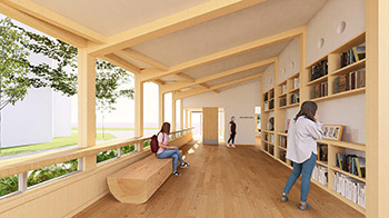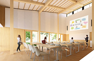 ・ 心身の健康や学生生活に何らかの不安を抱える学生に寄り添える空間を目指し、動線とゾーニングを配慮した計画です。エントランスホールを中心に、ウェルネスセンターとしての機能(医務室、相談室、休養室、メディテーションルーム等)と研修や公開講座用の多目的室を左右に配置します。エントランスホールは木造架構※2を現しにした温かみのある空間とし、多目的室は学びと交流のための開放的な環境とします。用途に応じて空間の性質を分けながらも「ひとつ屋根」の下でおおらかに全体がつながる構成は、平屋建ての魅力を活かした設計です。施設内にはこころ静かに過ごすためのメディテーションルームや誰もが安心して使えるオールジェンダートイレも設置します。