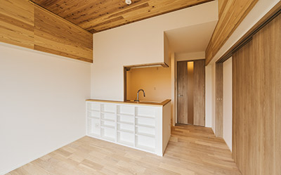 天井:梁現し/壁:漆喰/床:土間コンクリート金鏝仕上(かなごてしあげ)