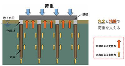 ・丸太を軟弱地盤に圧入し地盤を補強、丸太と地盤の双方で建築物を支える地盤改良工法。