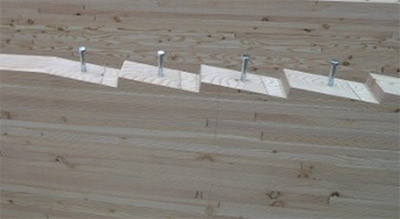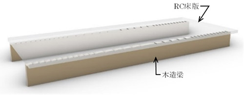 ※1 シアキ―(shear key)とは建築や土木分野で使われる構造部材におけるせんだん力(ずれるように働く力)の伝達要素。 今回の合成梁は、梁に曲げがかかった時に起こる水平方向のせんだん力を木質梁だけでなくRC床版にもシアキ―を介して伝達することで木質梁とRC床版が一体的に挙動する合成構造となる。