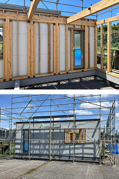 ・イソバンドBLの木造躯体への施工性、手順を検証。大工職と板金業者の混成チームで土台水切りから約半日で施工が完了。工期短縮を実現。