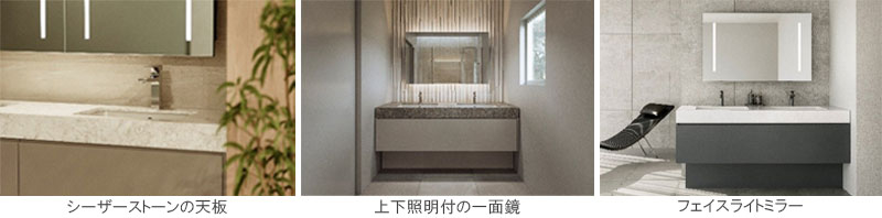 インテリアに馴染むデザイン性と機能性を両立する2タイプのミラーから選択できます。上下照明付の一面鏡は間接照明でやわらかな光を灯し、洗練された空間を演出します。フェイスライトミラーは縦型の照明で顔に影をつくりにくく、メイクやスキンケアの際に自然な明るさで快適に使用できます。