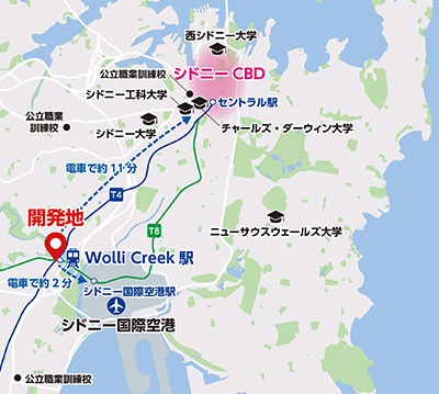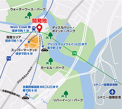 シドニーCBD(ビジネス中心地)の南西約8kmにあるWolli Creek(ウォーライ・クリーク)に位置します。物件はWolli Creek駅に直結し、電車でシドニー空港まで1駅(2分)、CBDまで3駅(11分)です。シドニーの主要幹線道路および高速道路入口までは車で約3~6分と、主要エリアへのアクセスが容易です。