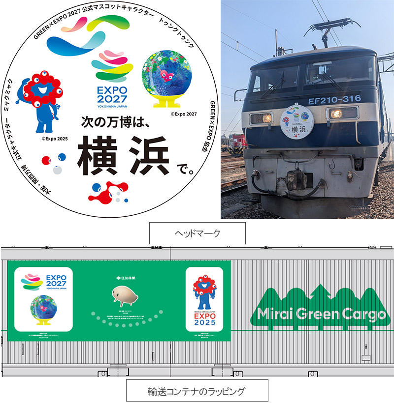 ■日本貨物鉄道株式会社(JR貨物): 大阪・関西万博に近い安治川口駅からGREEN×EXPO 2027会場に向け、貨物鉄道で樹木を輸送し、レガシー継承のつなぎ役を担当いたしました。また、記念のヘッドマークを作成しました。