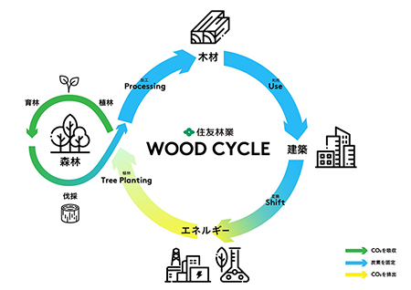 住友林業グループは森林経営から木材建材の製造・流通、戸建住宅・中大規模木造建築の請負や不動産開発、木質バイオマス発電まで「木」を軸とした事業をグローバルに展開しています。2030年までの長期ビジョン「Mission TREEING 2030」では住友林業のバリューチェーン「ウッドサイクル」を回すことで、森林のCO2吸収量を増やし、木造建築の普及で炭素を長期にわたり固定し、自社のみならず社会全体の脱炭素に貢献することを目指しています。今後も建築での木材・木材由来素材の利用と他材料から木への代替を促進し、脱炭素化を加速させます。