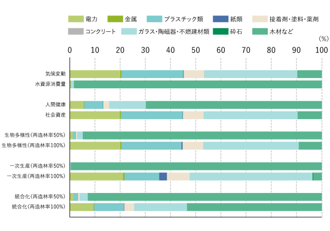 事業活動に伴う自然に関わる環境影響の定量的な把握を目的として、LIME3※1によるライフサイクルアセスメント(LCA)の試算を進めています。