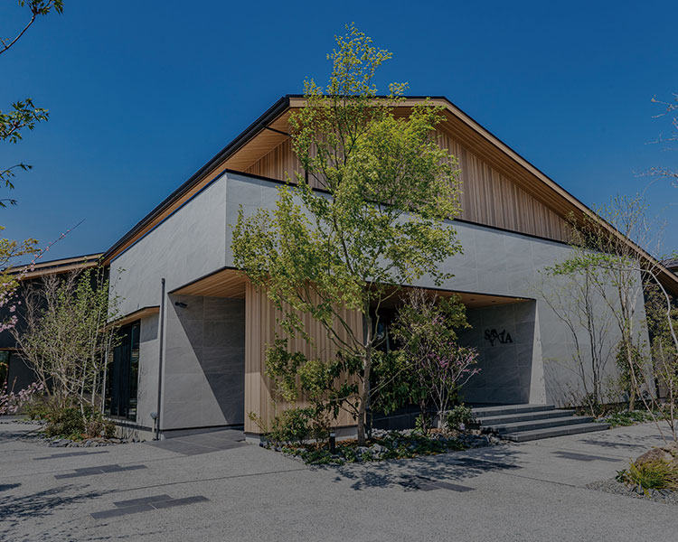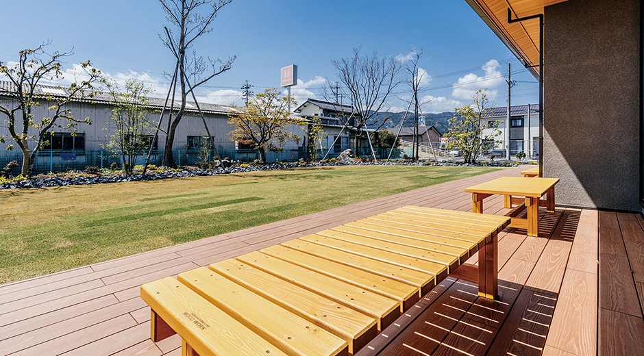 開放感あふれる建物と庭園をゆるやかにつなぐ広々としたウッドデッキスペース。庭園にも出やすく、心地よい空間を生み出しています。