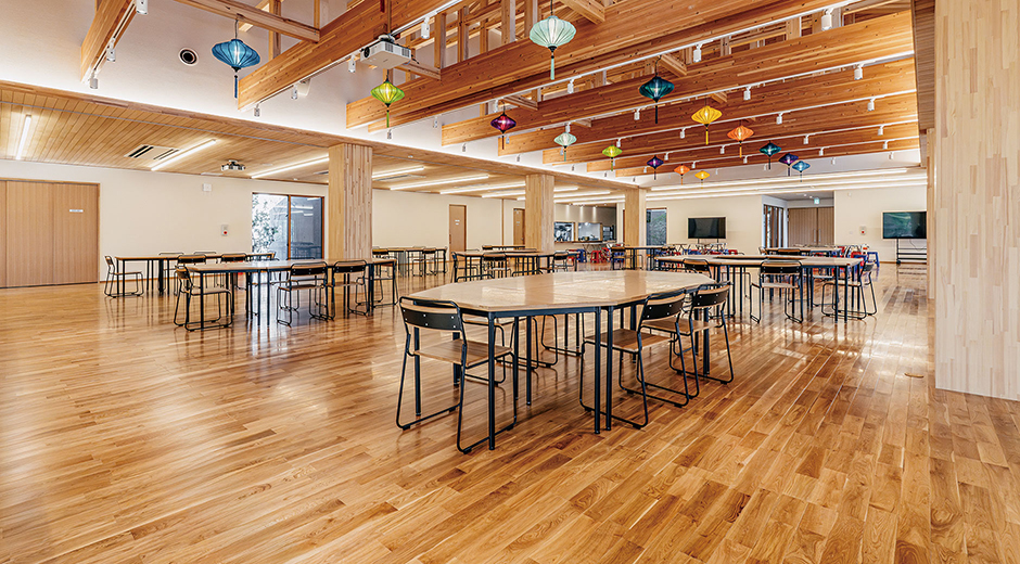 最大で500名規模の集会が可能な大食堂は、ビッグレーム構法が実現する大空間に柱や梁を現しにしたデザインを採用。木の持つ力強さと優しさを感じられます。