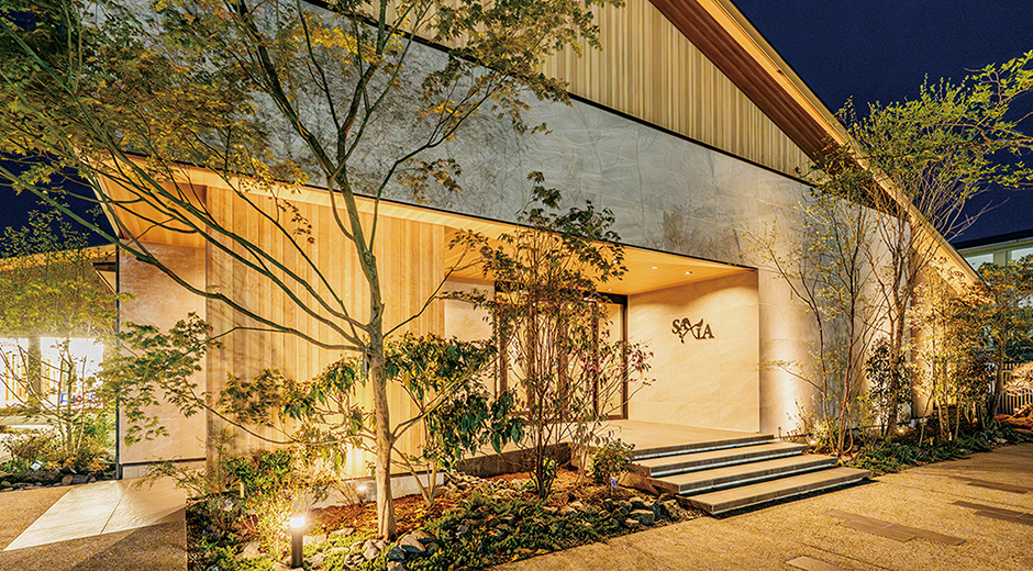 外観にも木の生み出すやわらかい表情を採り入れてデザイン。明かりに照らされたエントランスが夜景にも映えます。